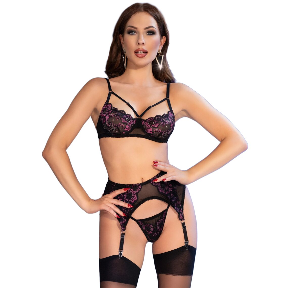 Elegante zwarte set met bloemenkant in rood of roze.