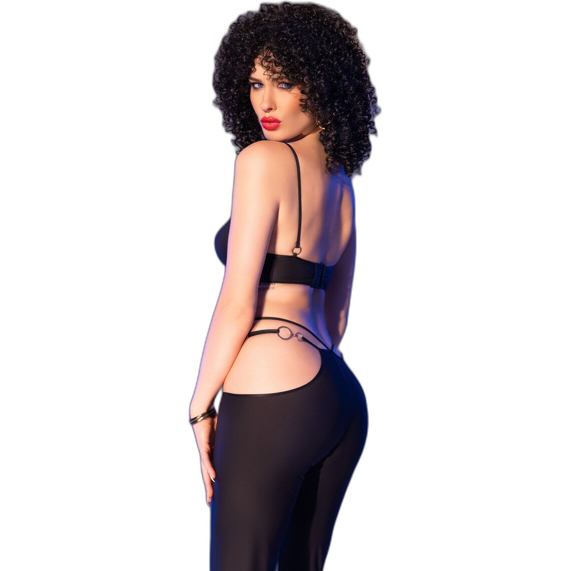 De strak aansluitende leggings vormen het lichaam en vallen op door hun sensuele zijdelingse openingen, die subtiel de heupen onthullen en een effect creëren dat zowel verleidelijk als elegant is. De gouden details zorgen voor harmonie en een verfijnde afwerking.