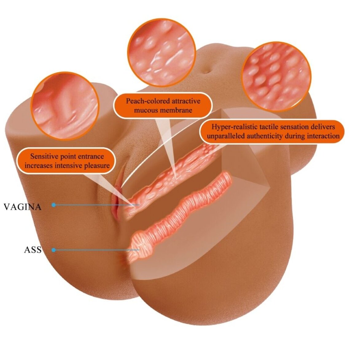 This masturbator features two realistic entrances: a tight, twisting vagina filled with internal ribs that stimulate every movement, and a tight anus for those seeking an extra challenge of pressure and realism. Its internal tunnel is Covered in spiral textures and strategically placed pleasure nodules to intensify every penetration and bring you to deeper climaxes.
