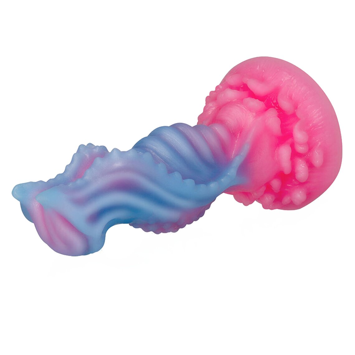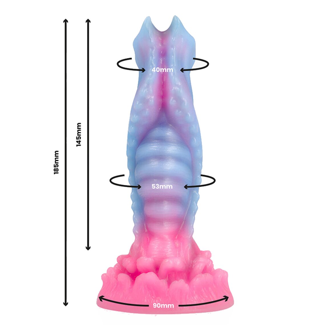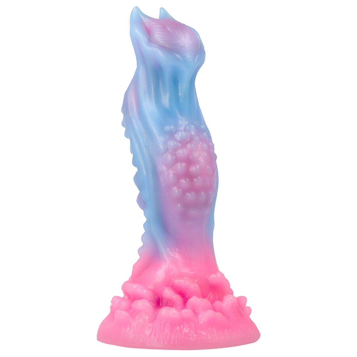 Fantasie dildo geïnspireerd op de zonsopgang. 18,5 cm hoog. Lichtblauw en roze.