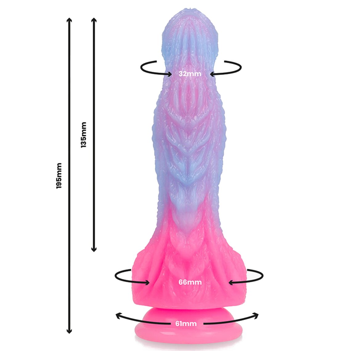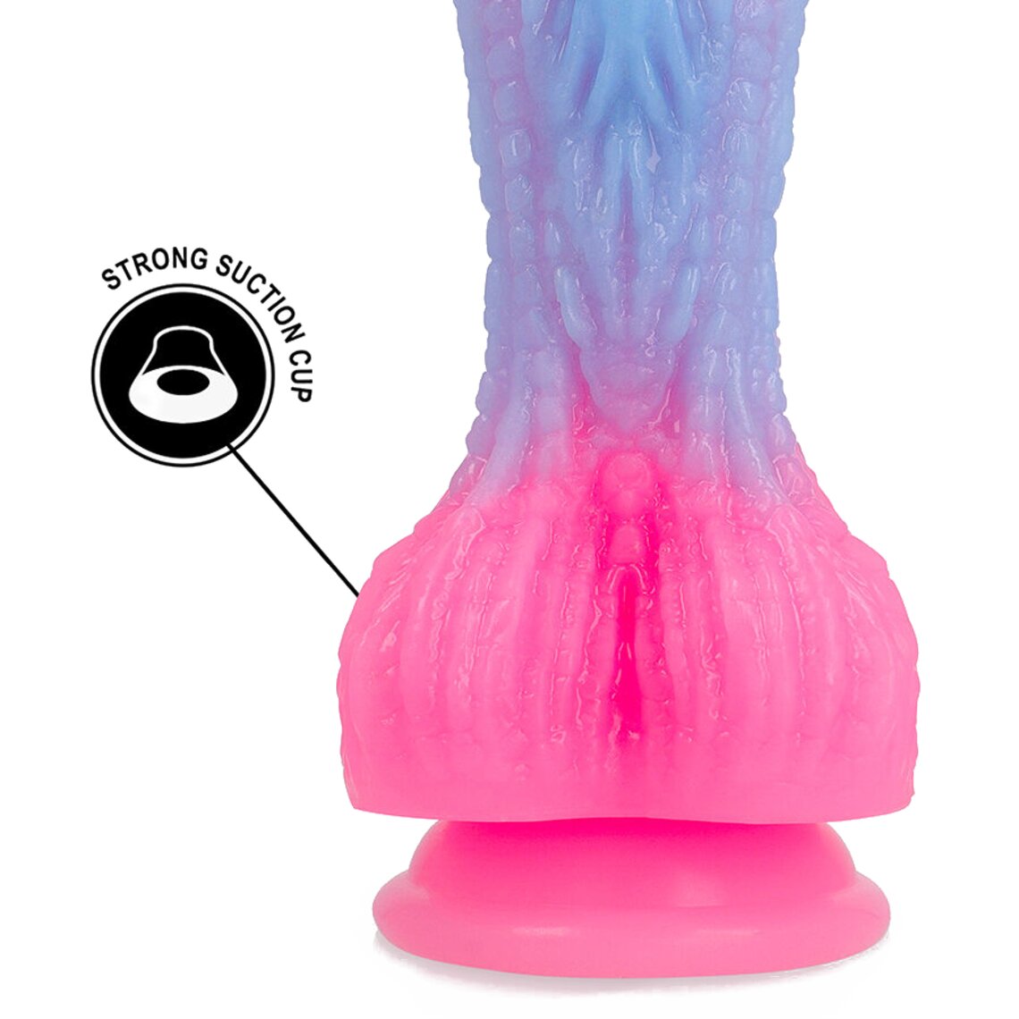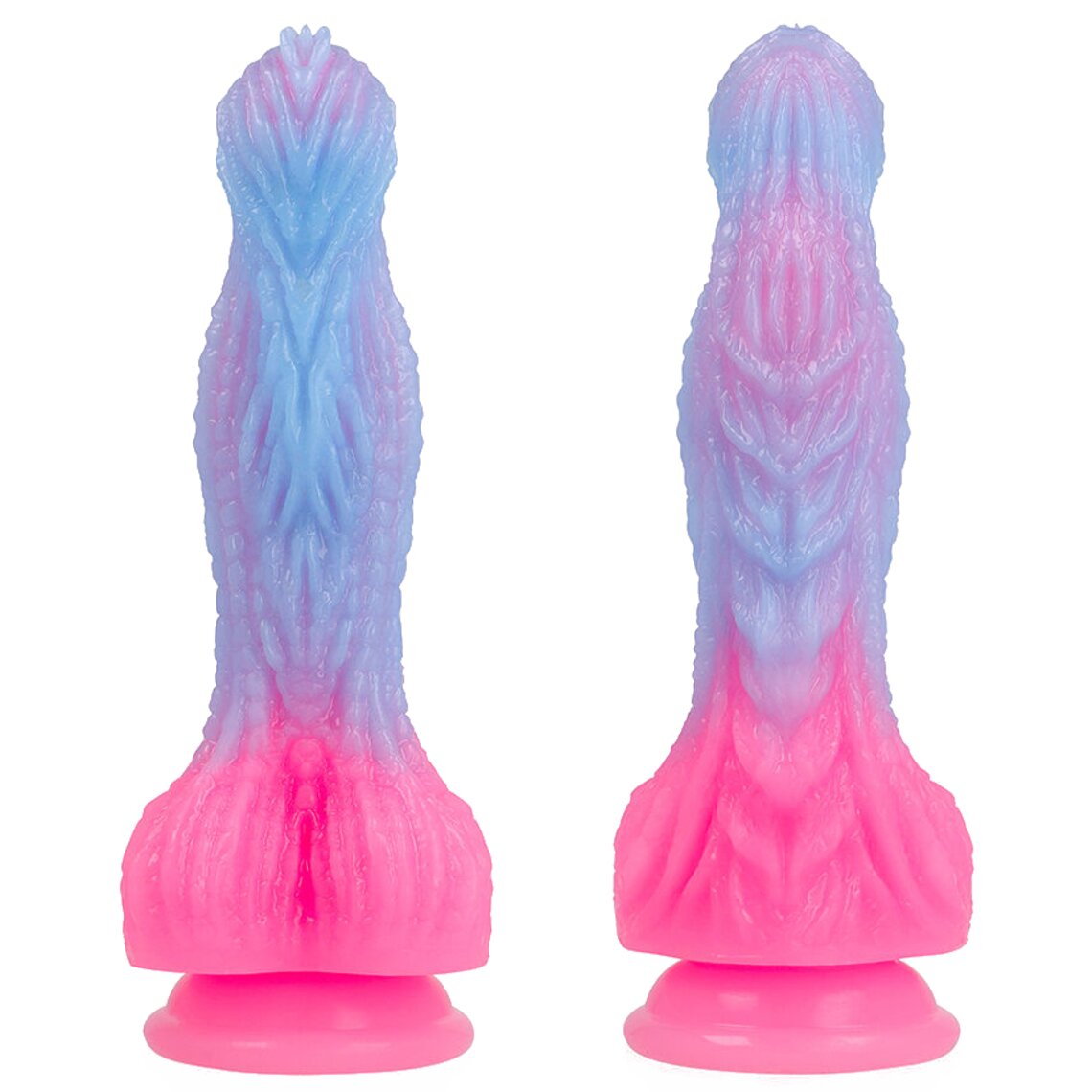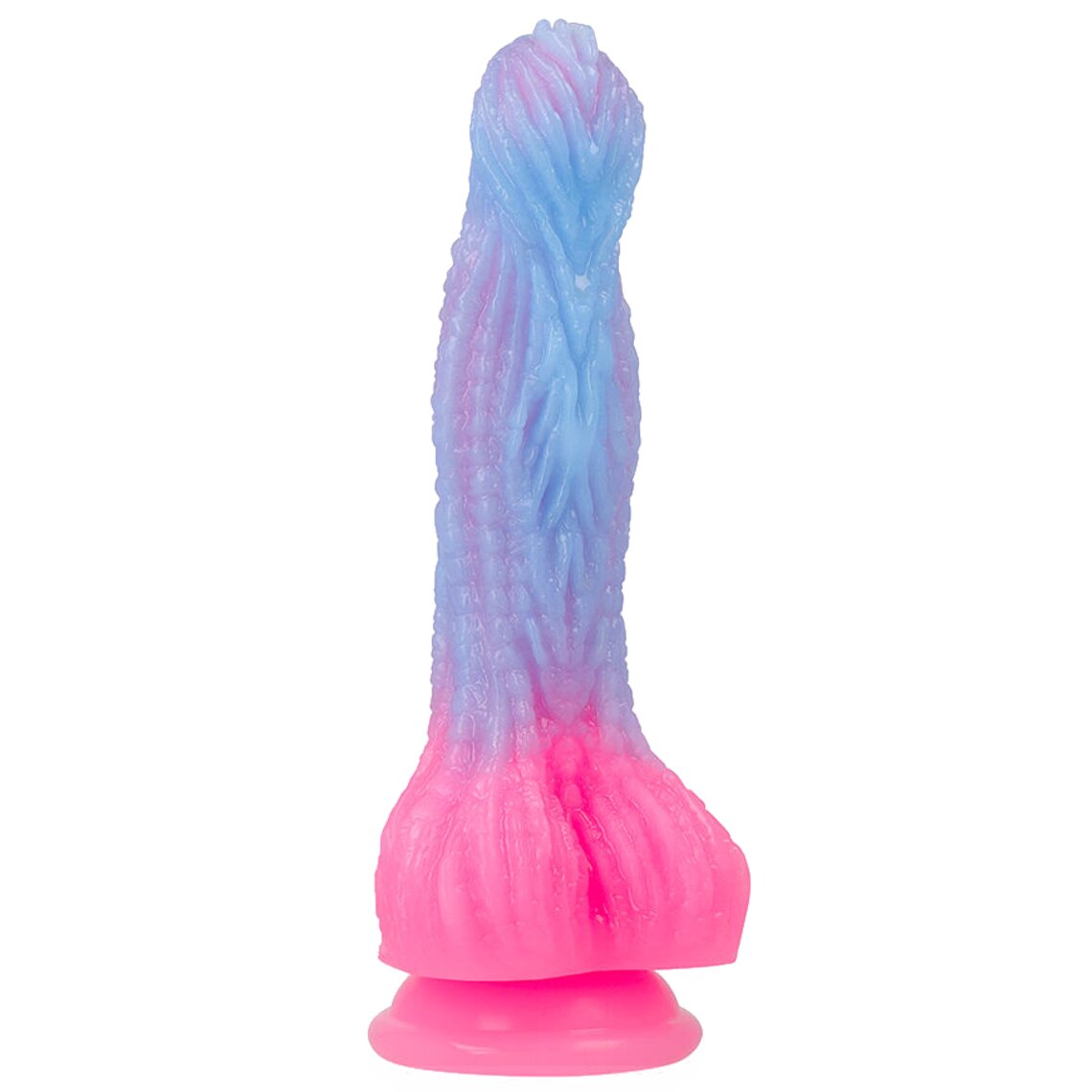 Grote fantasie dildo geïnspireerd op de zonsopgang. 19,5 cm hoog. Lichtblauw en roze.