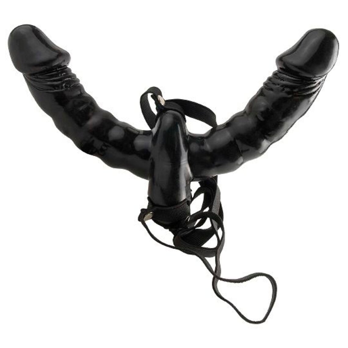 Seksueel harnas met twee zwarte dildo’s en vibratie. Voor vrouwelijke koppels.