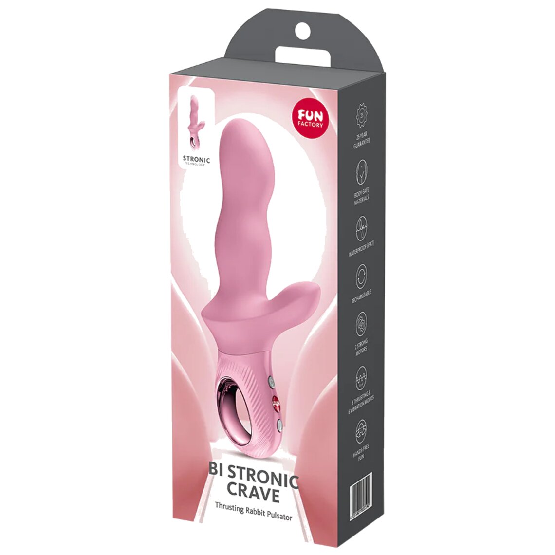 Whether solo or with a partner, the BI STRONIC CRAVE fits seamlessly into any fantasy and is crafted from body-friendly silicone for ultimate comfort. Its ergonomic LOOP handle featuring a textured, ribbed, non-slip surface gives you control when you want it, while the intuitive 3-button interface keeps things effortless. Want to take it up a notch? Always use a water-based lubricant for even deeper sensations. The BI STRONIC CRAVE comes with a 25-year FUN FACTORY warranty, guaranteeing exceptional quality, durability, and endless enjoyment.