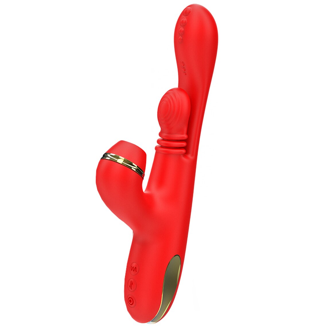 Rode vibrator met verwisselbare koppen. 3 functies: vaginale vibratie, clitorisstimulatie en G-spot stimulatie.