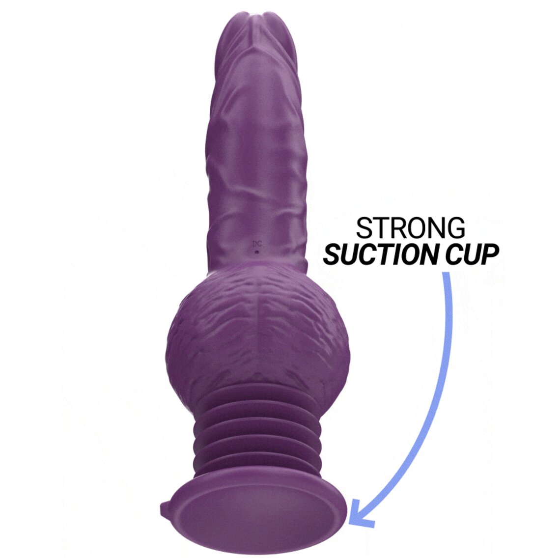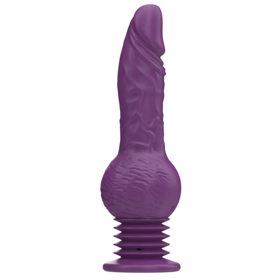 Paarse dildo met twee motoren, stootfunctie en zuignap.