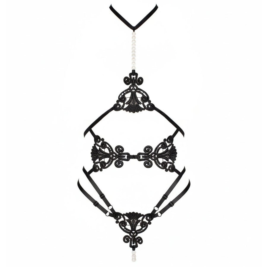 Erotische zwarte body met bandjes, kanten details en decoratieve parels.