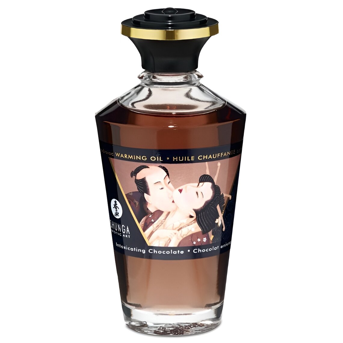 Prikkel de zintuigen met de Shunga massageolie met verwarmend effect en intense chocoladesmaak. De zijdezachte textuur en het subtiele warmte-effect zorgen voor een omhullende ervaring en maken van elke aanraking een intiem en sensueel moment.