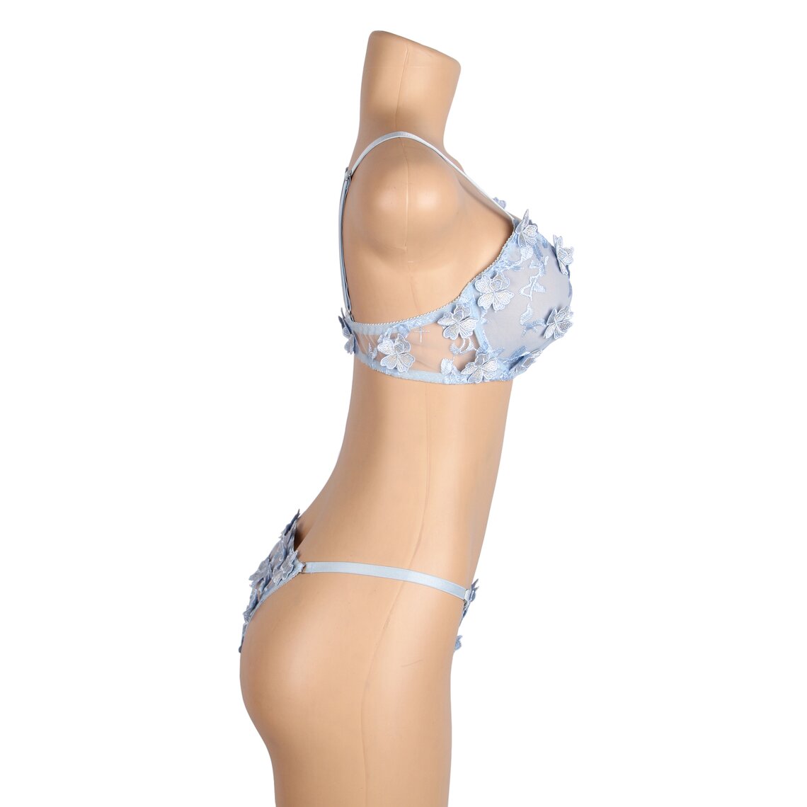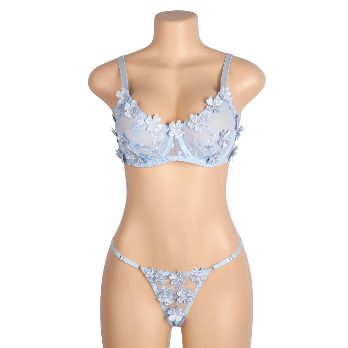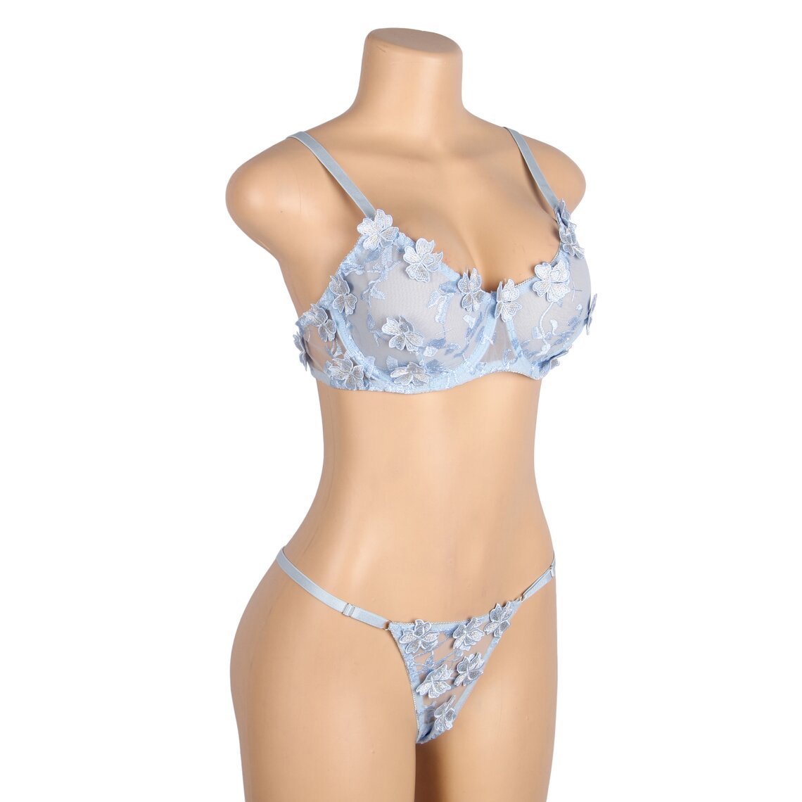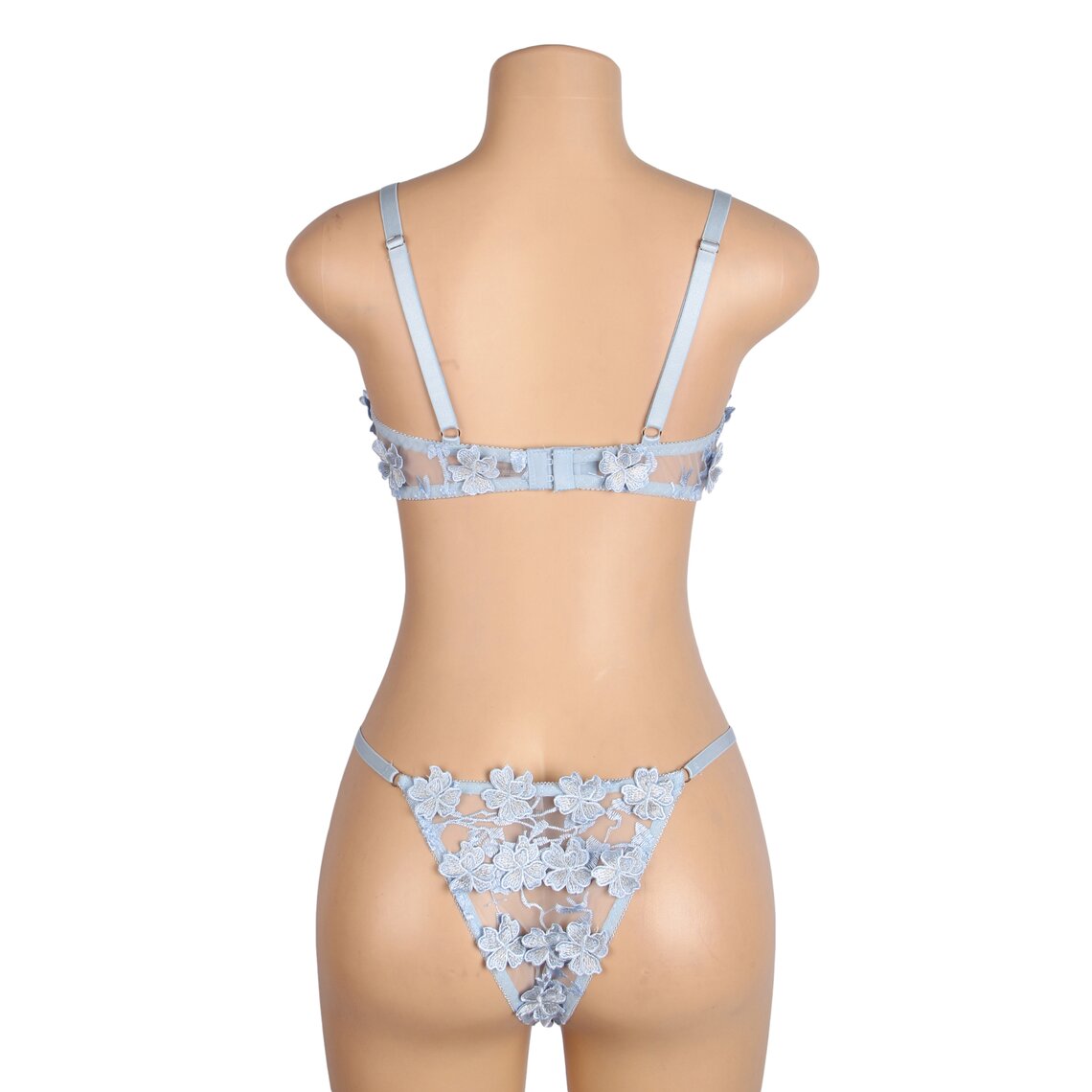 Ontdek de elegantie en sensualiteit van de florale set van SUBBLIME, een lingeriestuk ontworpen om de vrouwelijkheid te benadrukken met een romantische en verfijnde stijl. Deze delicate set combineert transparante stoffen en bloemenborduursels in een zachte lichtblauwe tint die een frisse, elegante en zeer verleidelijke uitstraling geeft.