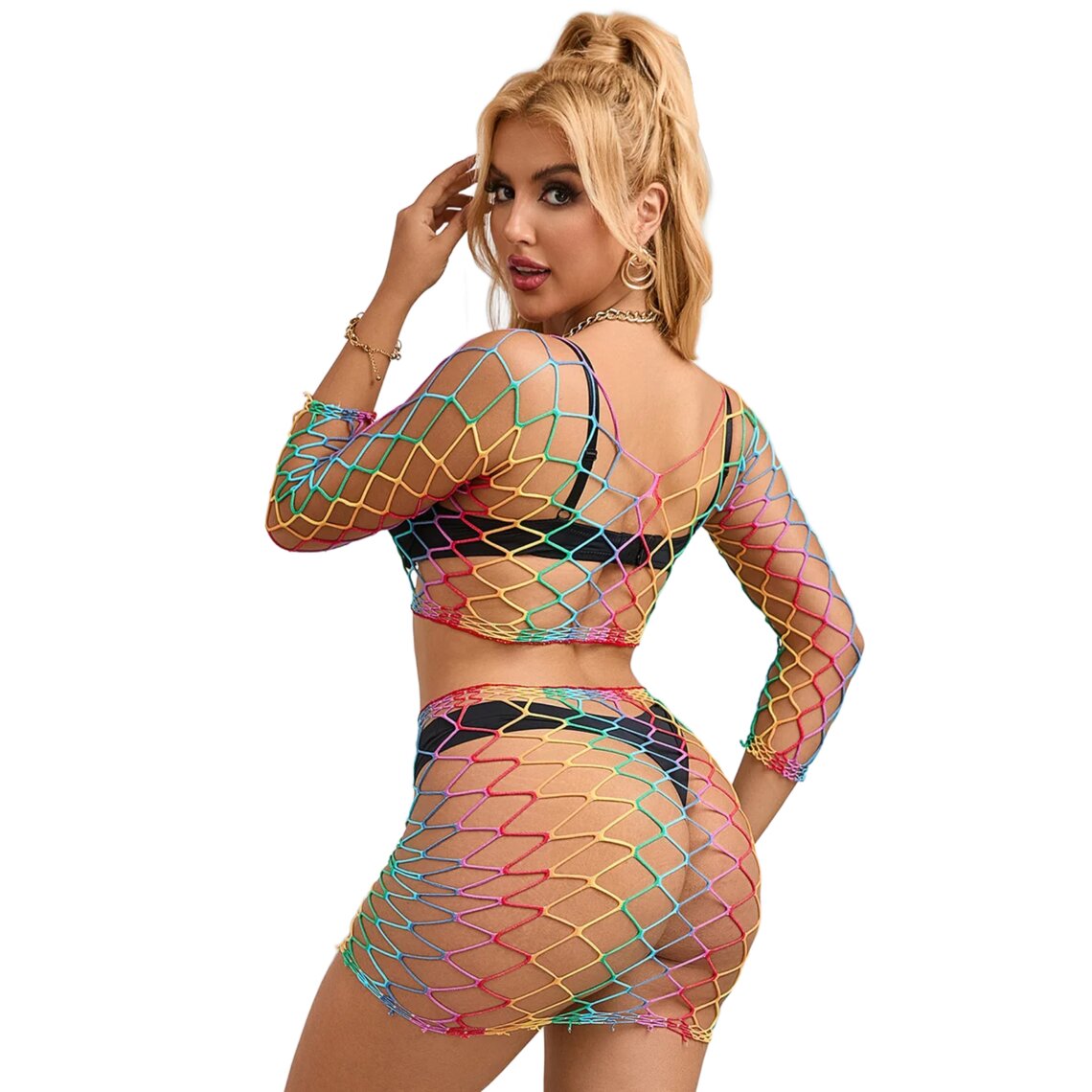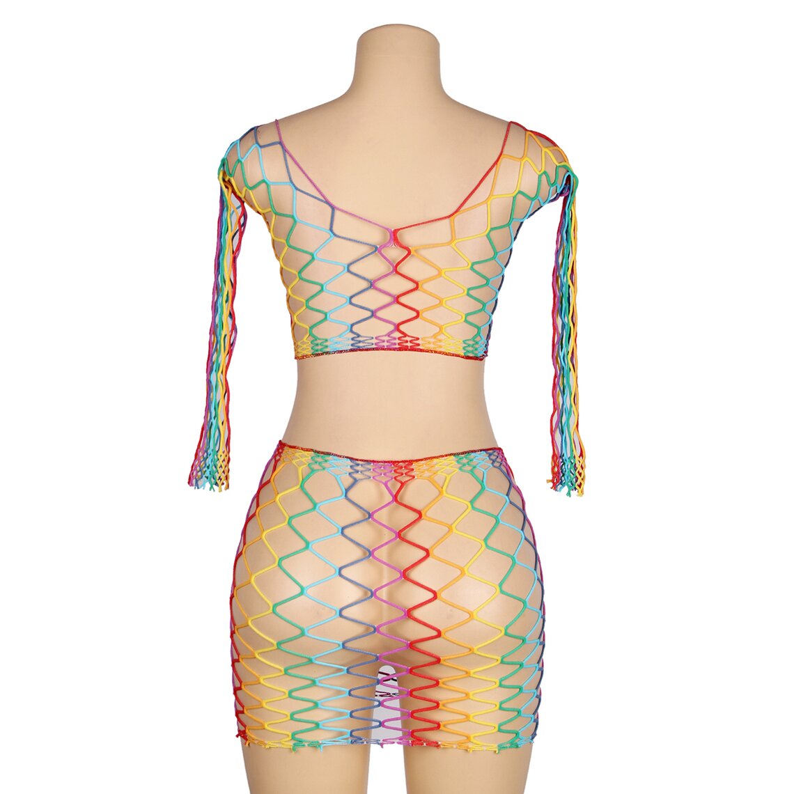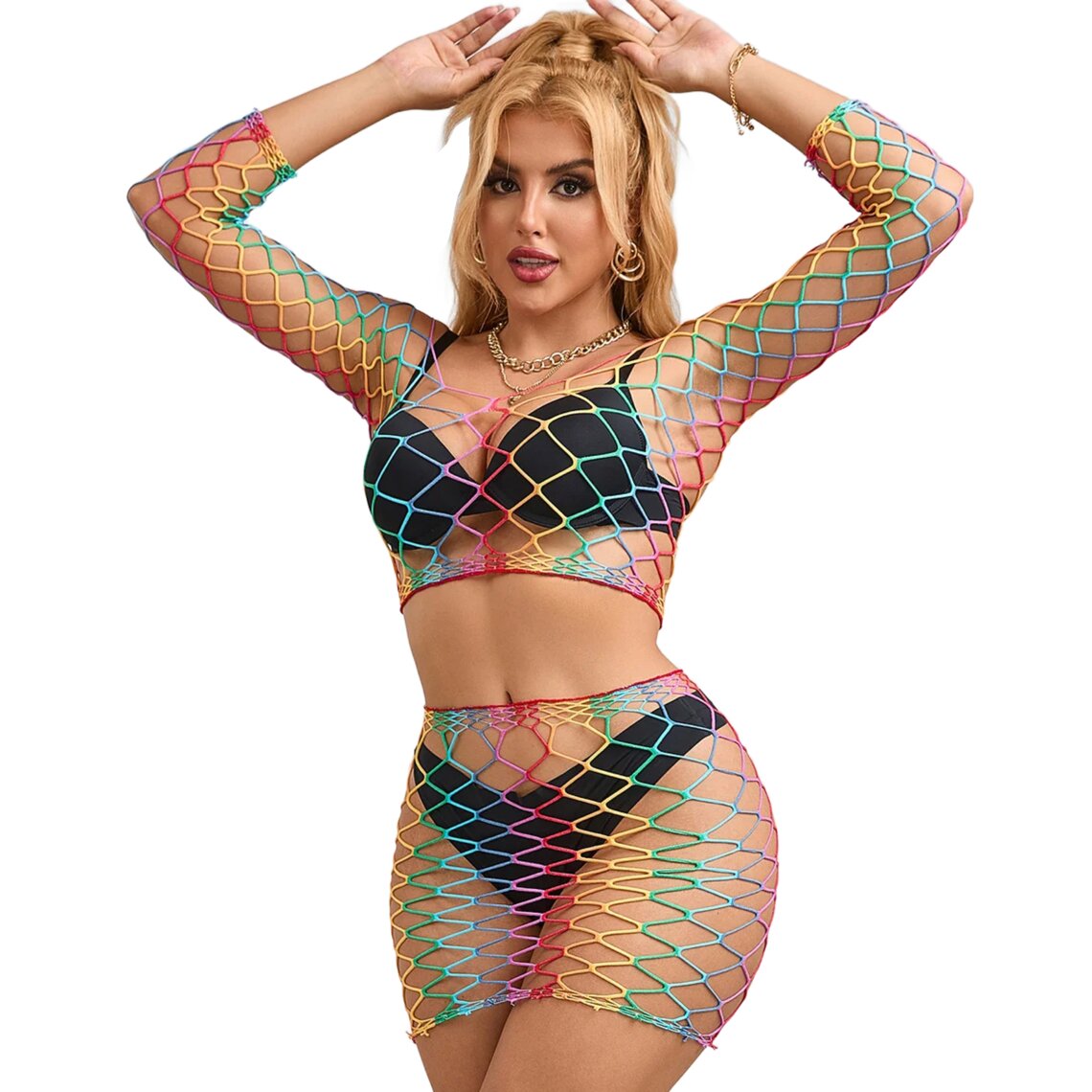 Sexy lingerie set van multicolor netstof met lange mouwen.