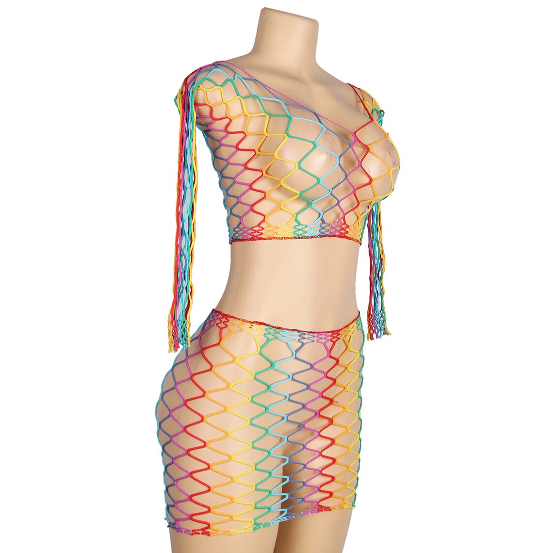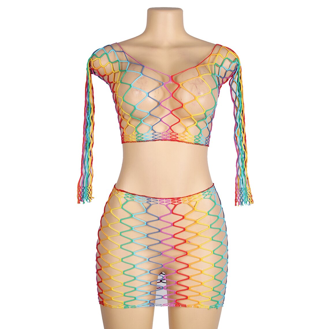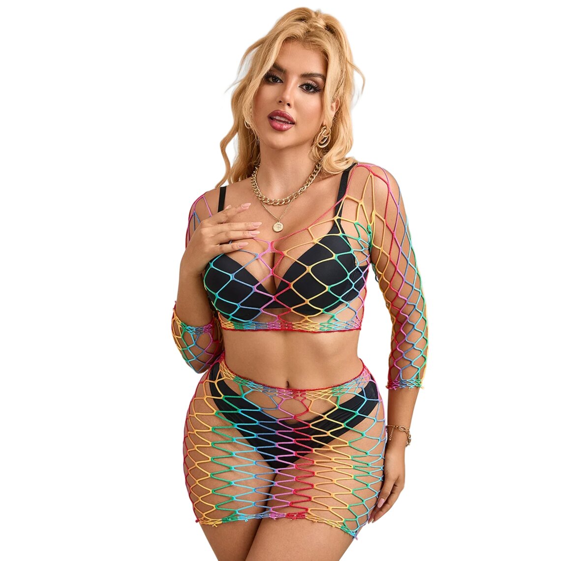 Sexy lingerie set van multicolor netstof met lange mouwen.